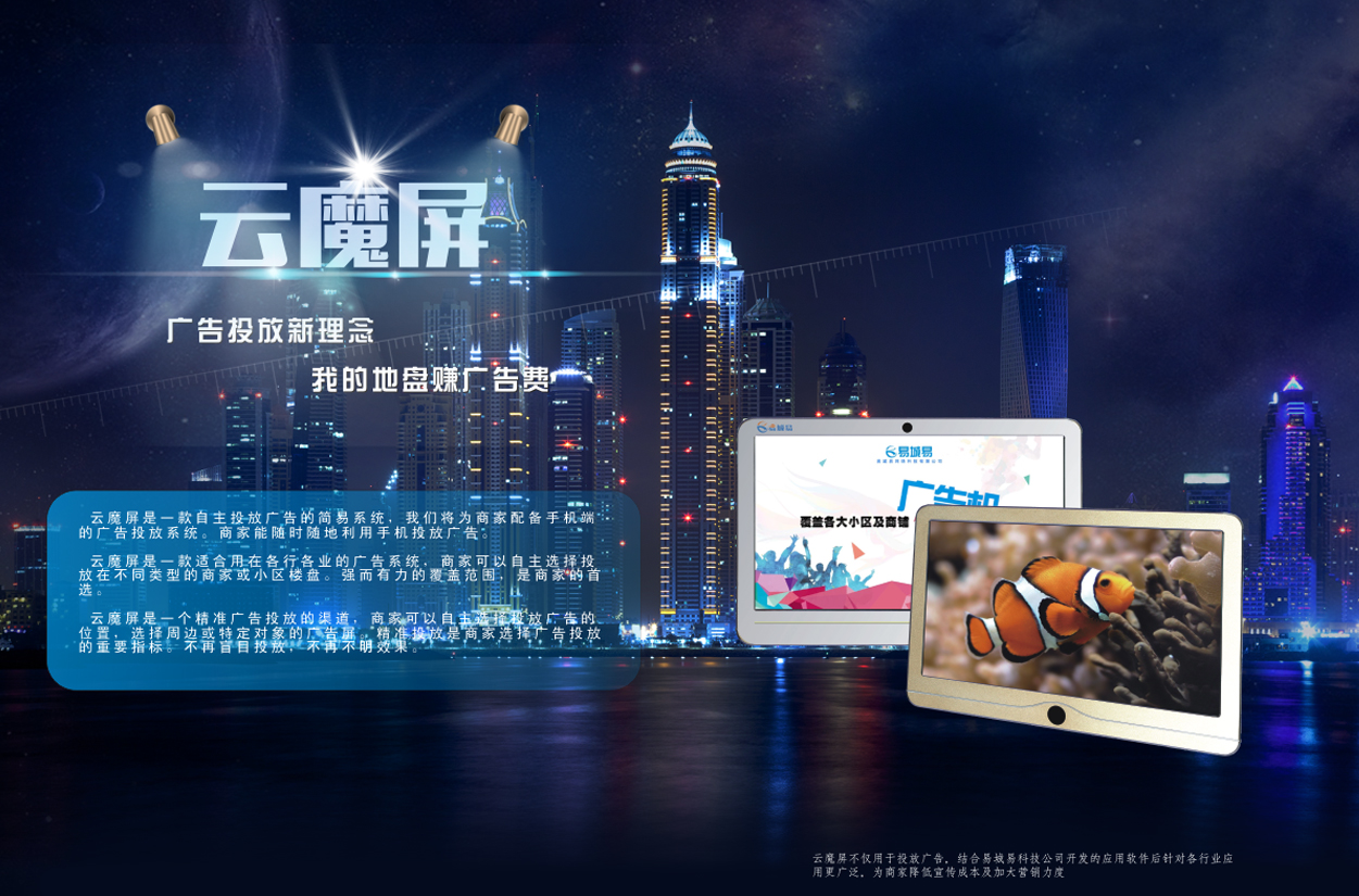 易城易云魔屏+是互聯(lián)網(wǎng)+傳媒+智能硬件與軟件的科技。專(zhuān)注打造“互動(dòng)媒體+廣告”的新媒體平臺(tái),以做為應(yīng)用場(chǎng)景,增加商家的宣傳價(jià)值、開(kāi)創(chuàng)互聯(lián)網(wǎng)互動(dòng)媒體新局面。